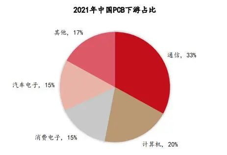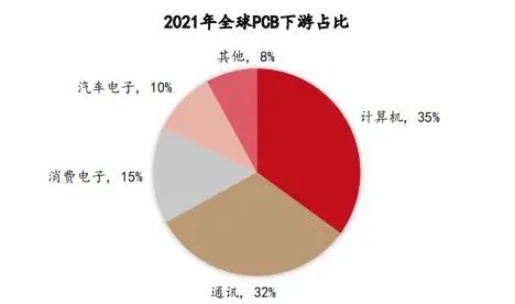 從下游應用的角度,根據 Prismark 的數據,2021年全球 PCB各類應用中,計算機領域占比接近 35%,排名[敏感詞];通訊占比 32%,排名第二;消費電子占比 15%,排名第三;汽車電子占比 10%,排名第四。